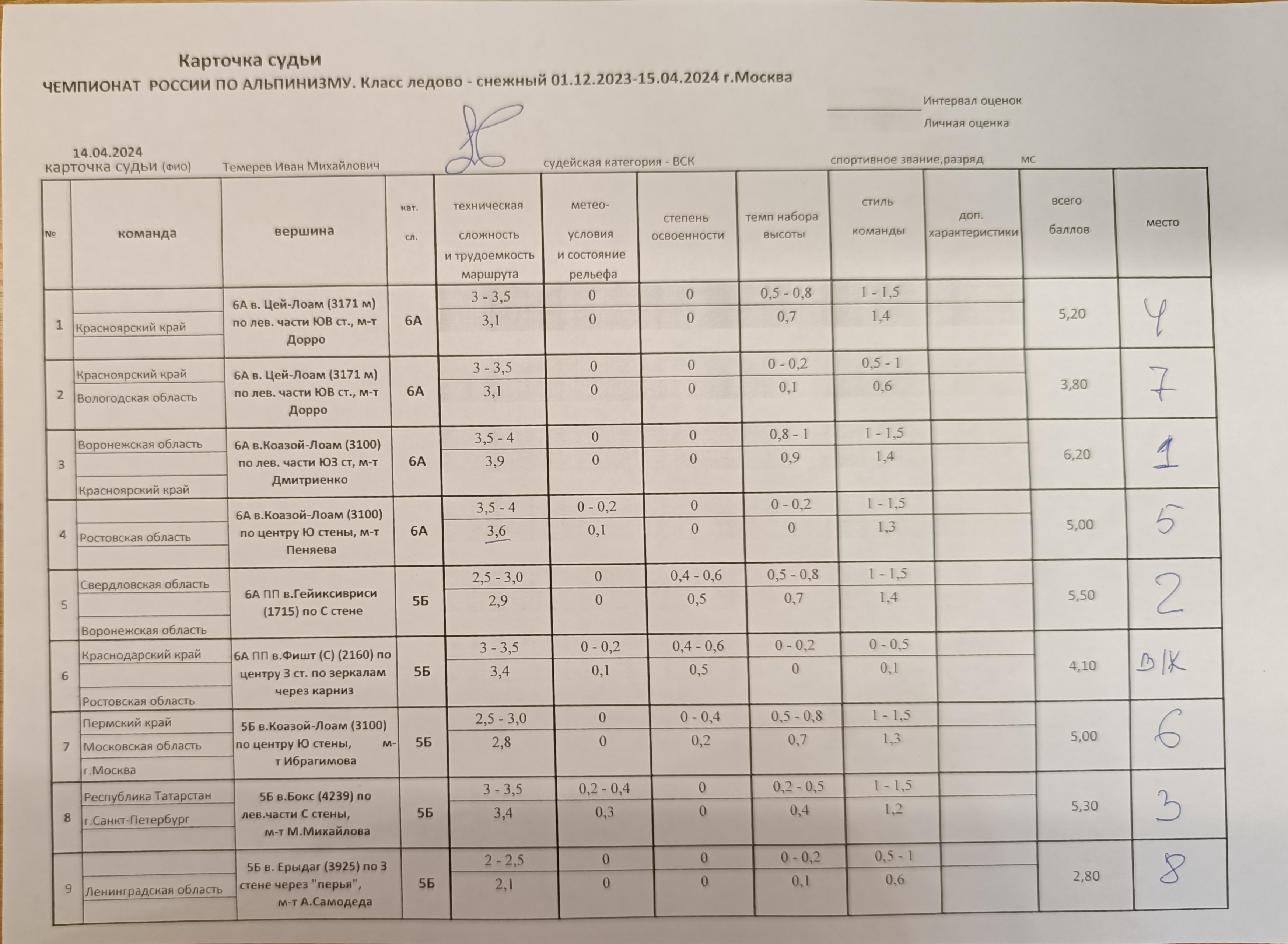 6.3. Оценку восхождений и определение мест, занимаемых командами, судейская коллегия производит на основании отчетов, Положения в соответствии с «Методикой оценки восхождений при судействе высотного, высотно-технического, ледово-снежного классов соревнований по альпинизму».