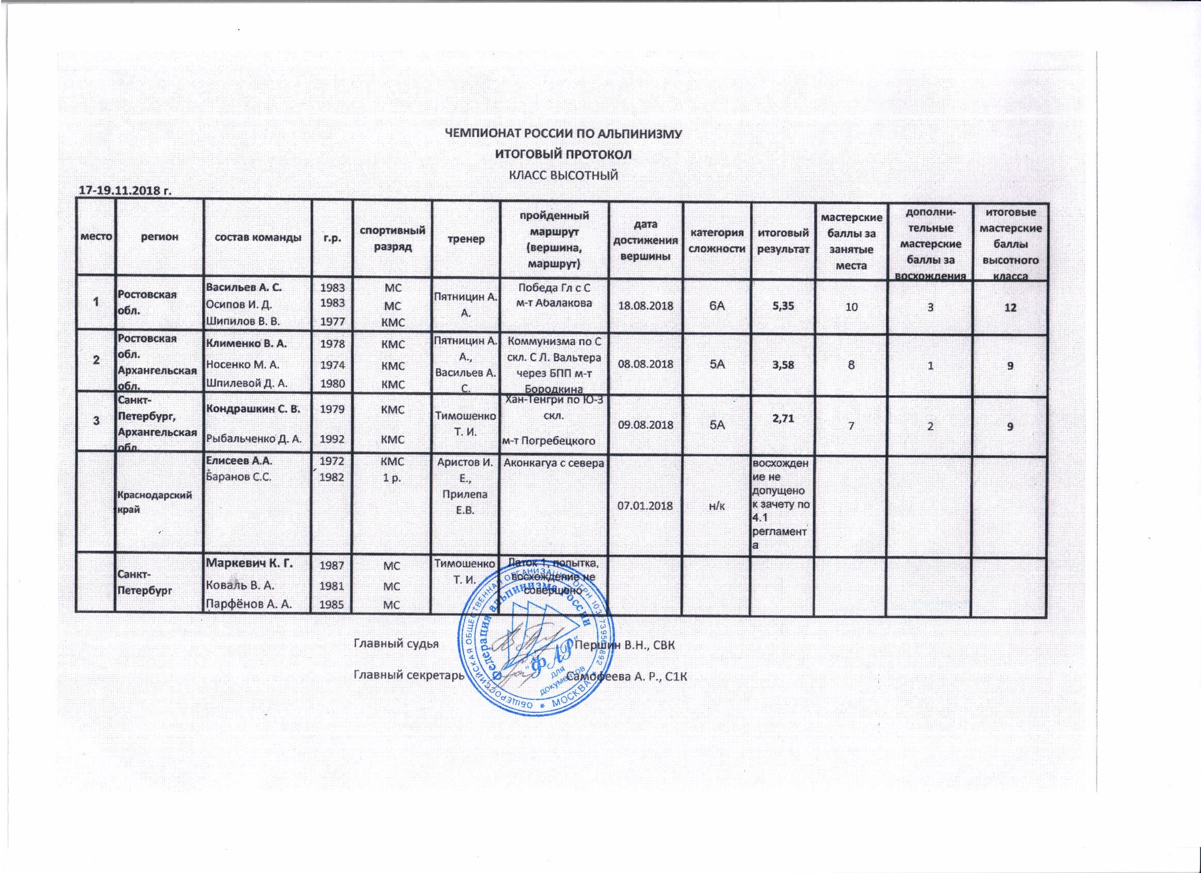 4.1. Дата выезда команды, а также выбор горного района, в котором совершается восхождение, определяются руководителем команды. К зачету принимаются все восхождения не ниже 5А категории сложности, совершенные в период чемпионата, по классифицированным и не классифицированным маршрутам, за исключением, пройденных в коммерческих группах и по обработанным маршрутам.