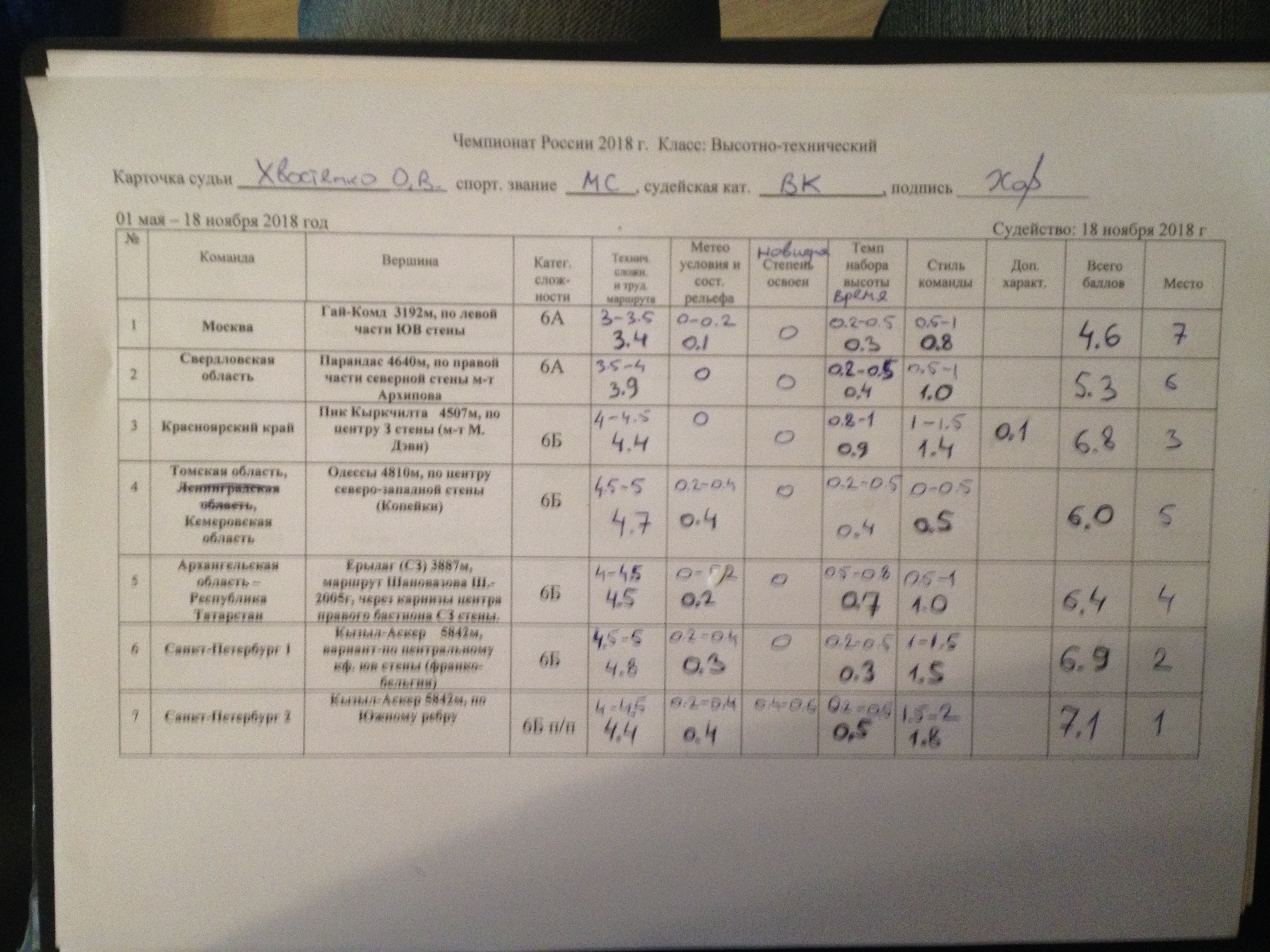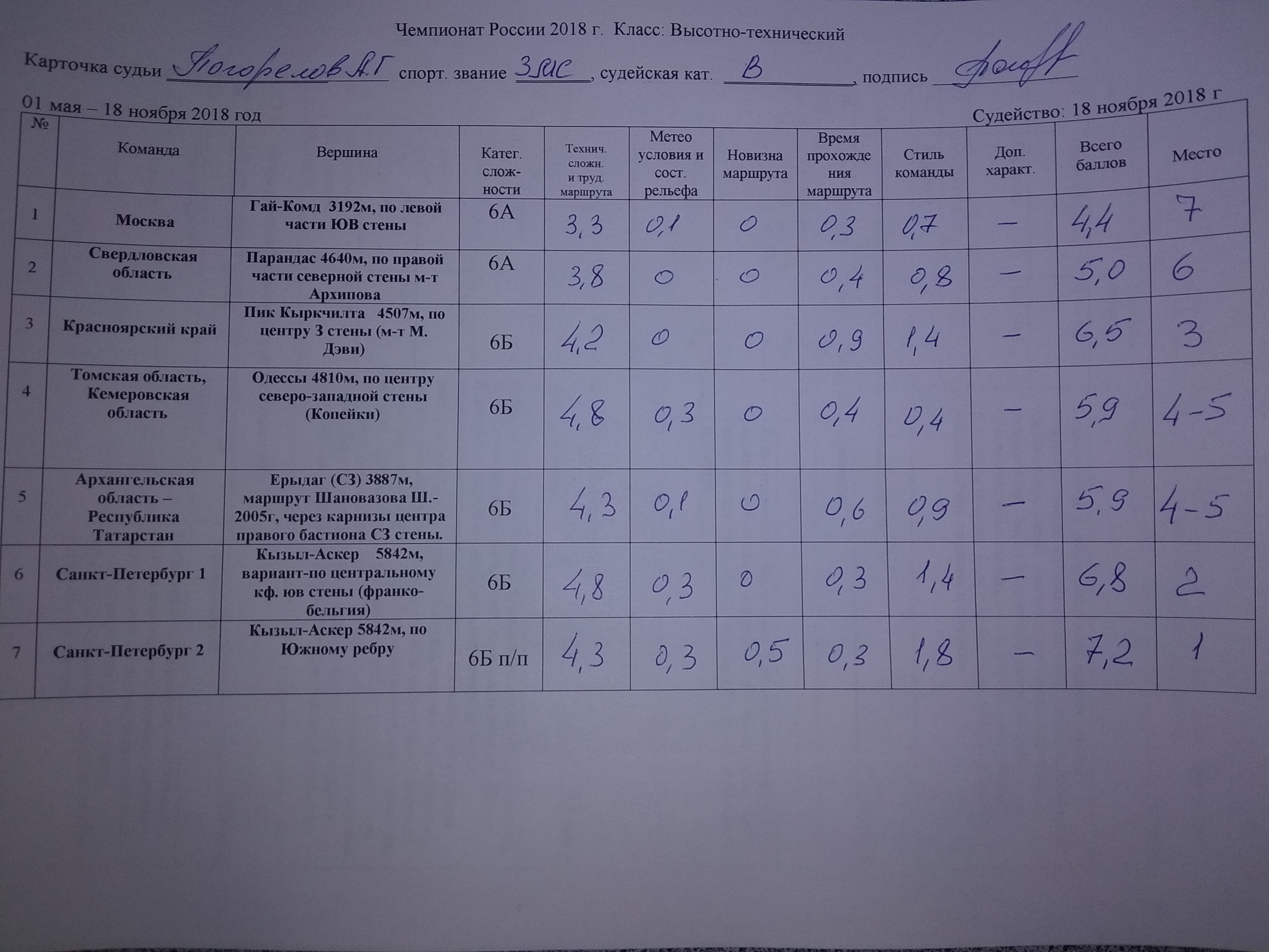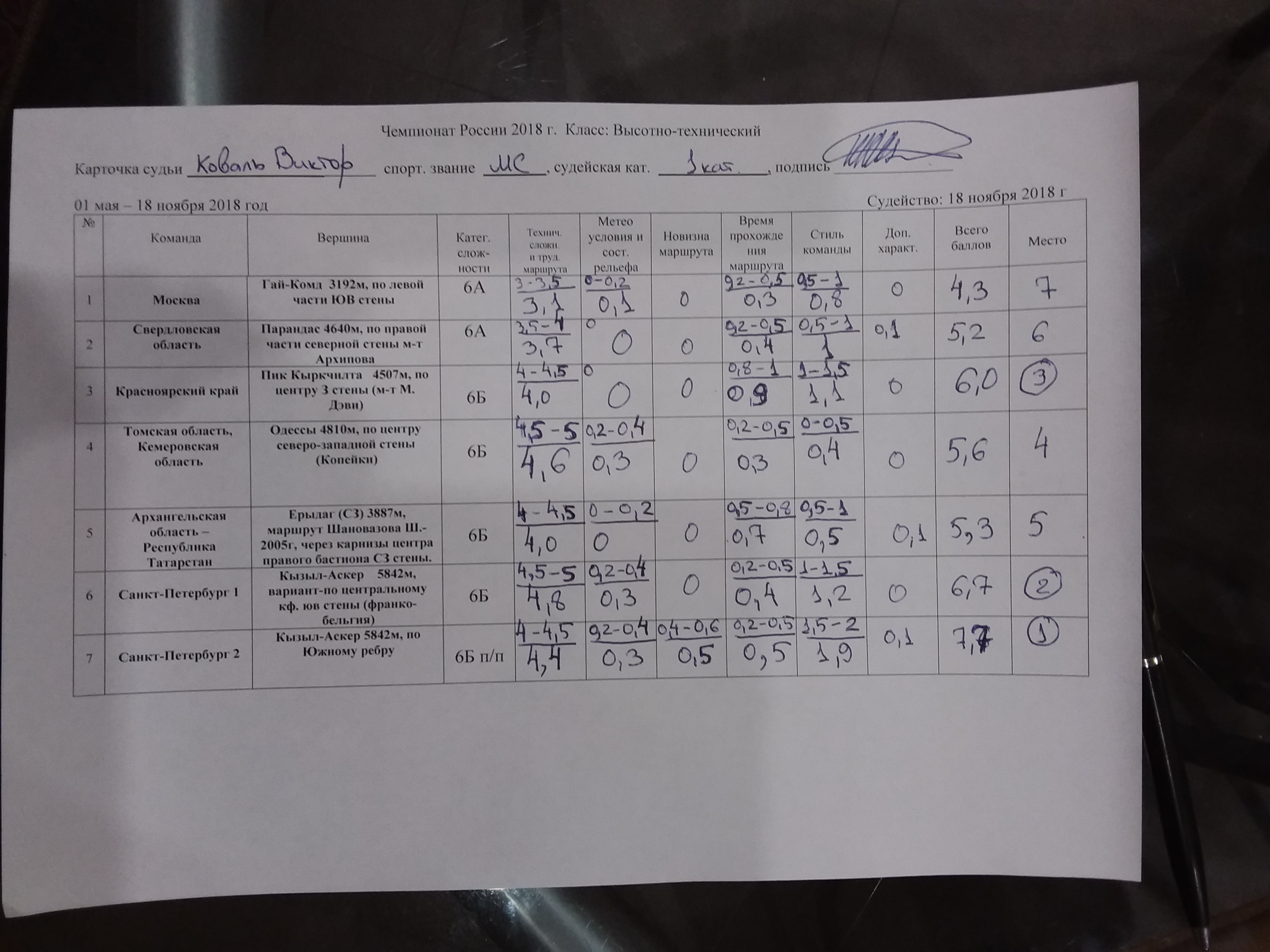 6.3. Оценку восхождений и определение мест, занимаемых командами, судейская коллегия производит в соответствии с «Методикой оценки восхождений при судействе соревнований по альпинизму» на основании отчетов.» Лучшей признается команда, набравшая наибольшее количество баллов.