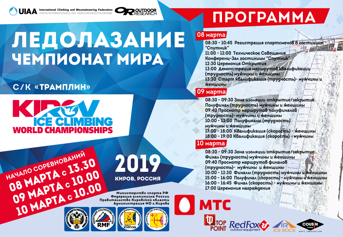 Россию представит сборная в составе 34 спортсменов. Среди них – группа кировских ледолазов: Мария Толоконина, Екатерина Кощеева, Екатерина Феоктистова, Валерия Богдан, Марьям Филиппова, Антон Сухарев, Владислав Юрлов, Никита Глазырин, Максим Томилов, Алексей Деньгин.
