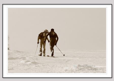 Скитуровское снаряжение как раз предусматривает возможность спусков по любым склонам, и по ледяным склонам, жестким, и по целине. Конечно, производители лыжного снаряжения предлагают разные лыжи, пошире – для целинного катания, поуже – для гонок. Довольно разное снаряжение, но объединяет их одно, наличие, как и у горных лыж, металлических кантов, и малый вес, что позволяет без особых нагрузок передвигаться на лыжах. Если человек умеет спускаться на горных лыжах, то подниматься наверх научится быстро. Движение на лыжах наверх очень приближено к нашей обычной ходьбе, никаких особых премудростей в технике нет, надел лыжи и идешь наверх, учиться ничему особо не надо. Человек легко схватывает это и понимает, что от него требуется. Технические моменты заключаются в том, как правильно приклеить камус, как его отклеить, куда убрать, как за ним ухаживать, чтобы он не намокал, не портился, не пачкался.