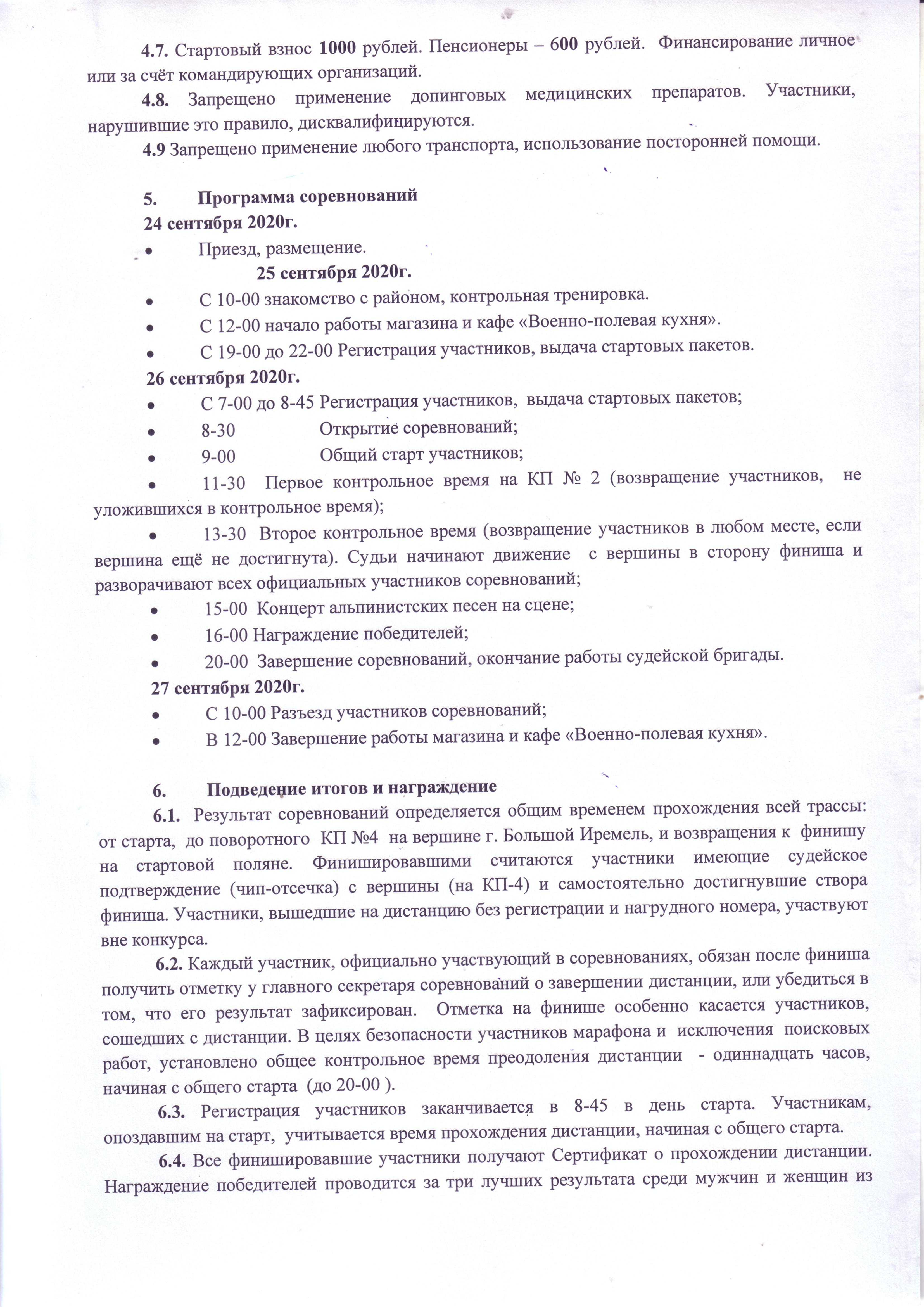 6.1.Результат соревнований определяется общим временем прохождения всей трассы: от старта,до поворотного КП №4 на вершине г. Большой Иремель, и возвращения к финишу на стартовой поляне. Финишировавшими считаются участники имеющие судейское подтверждение (чип-отсечка) с вершины (на КП-4) и самостоятельно достигнувшие створа финиша. Участники, вышедшие на дистанцию без регистрации и нагрудного номера, участвуют вне конкурса.