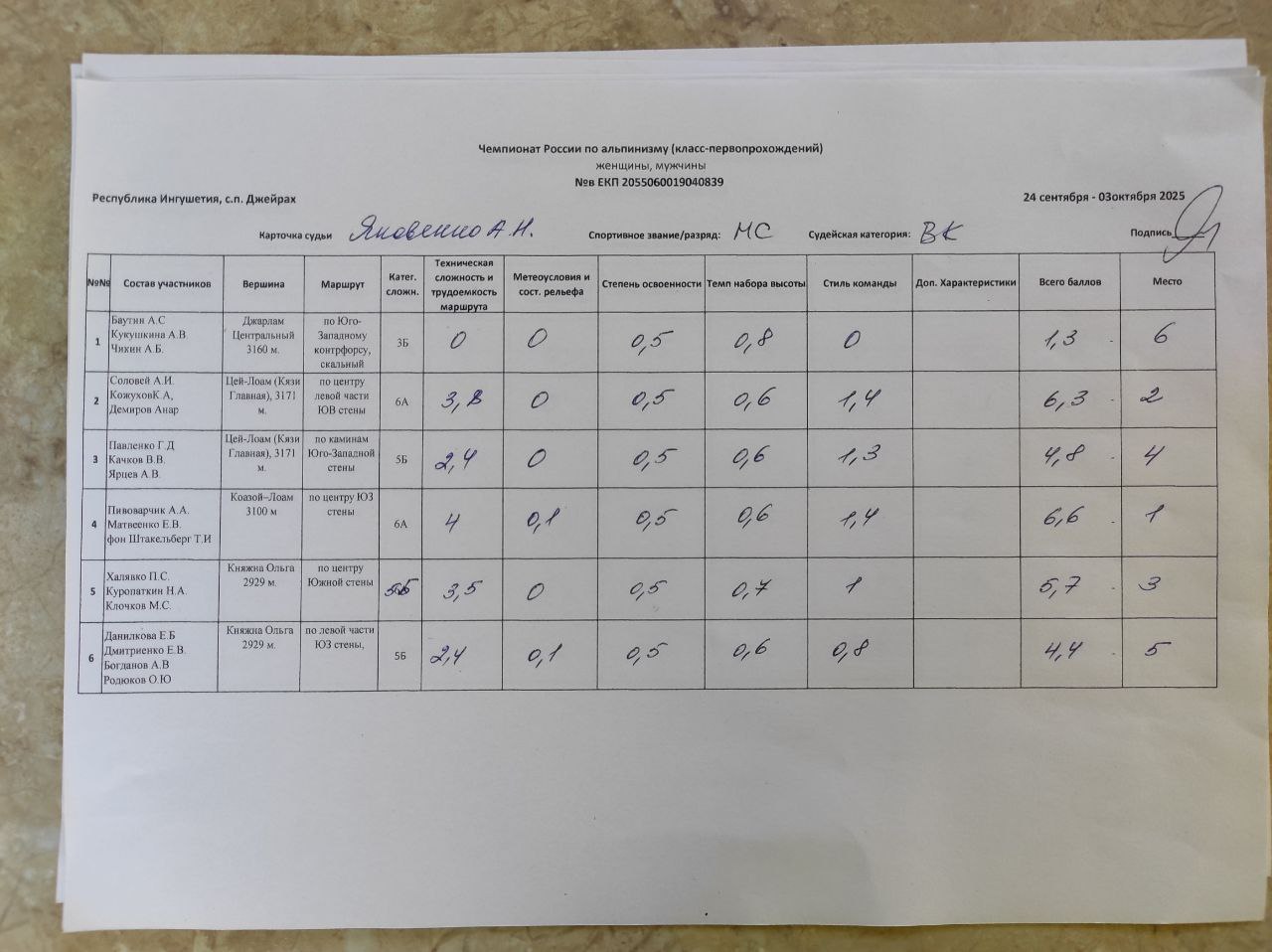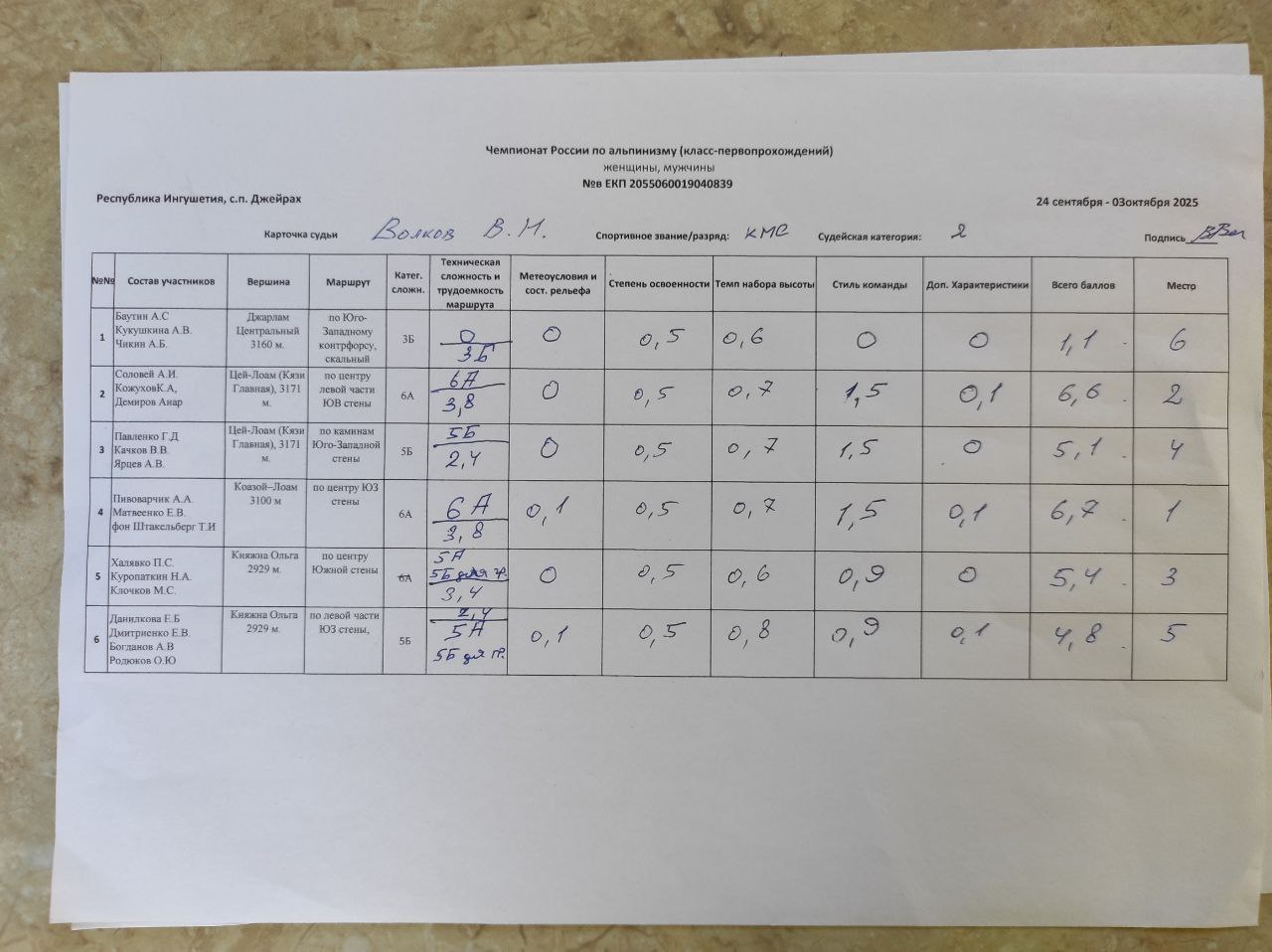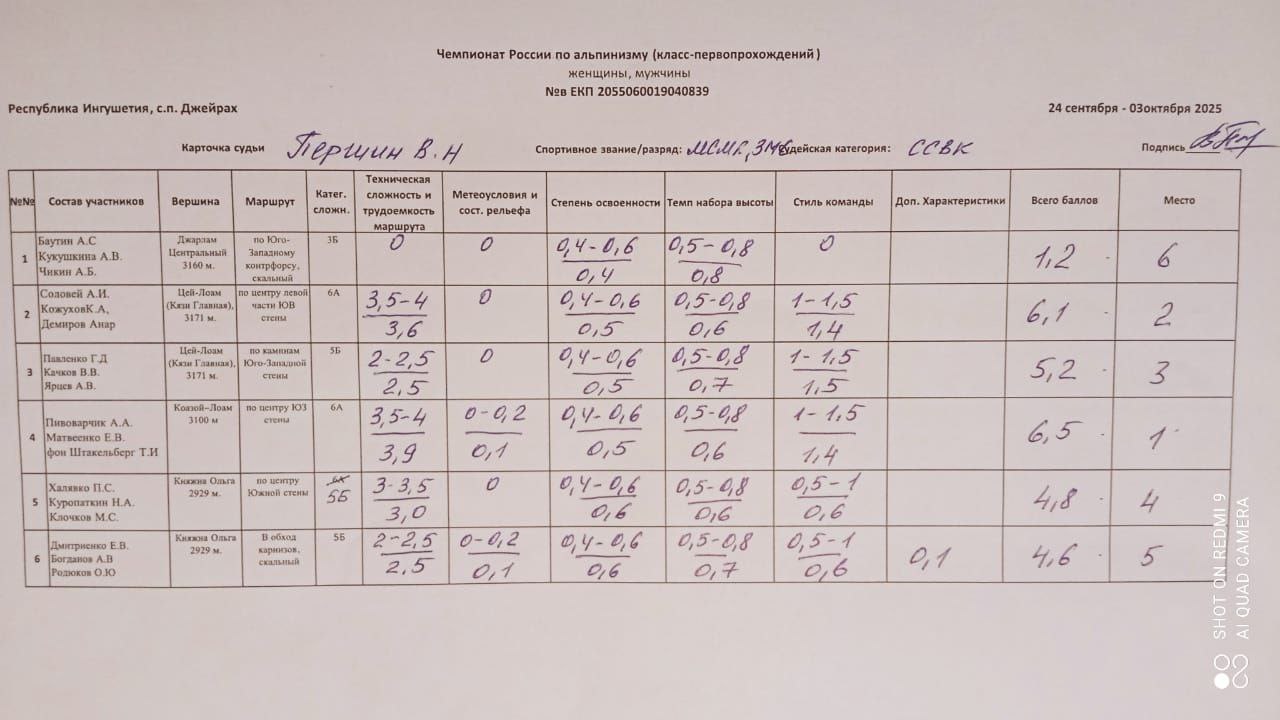 7.2. Оценку восхождений и определение мест, занимаемых командами, судейская бригада производит на основании отчетов, в соответствии с «Методикой оценки восхождений при судействе высотного, высотно-технического, ледово-снежного классов и класса-первопрохождений соревнований по альпинизму».