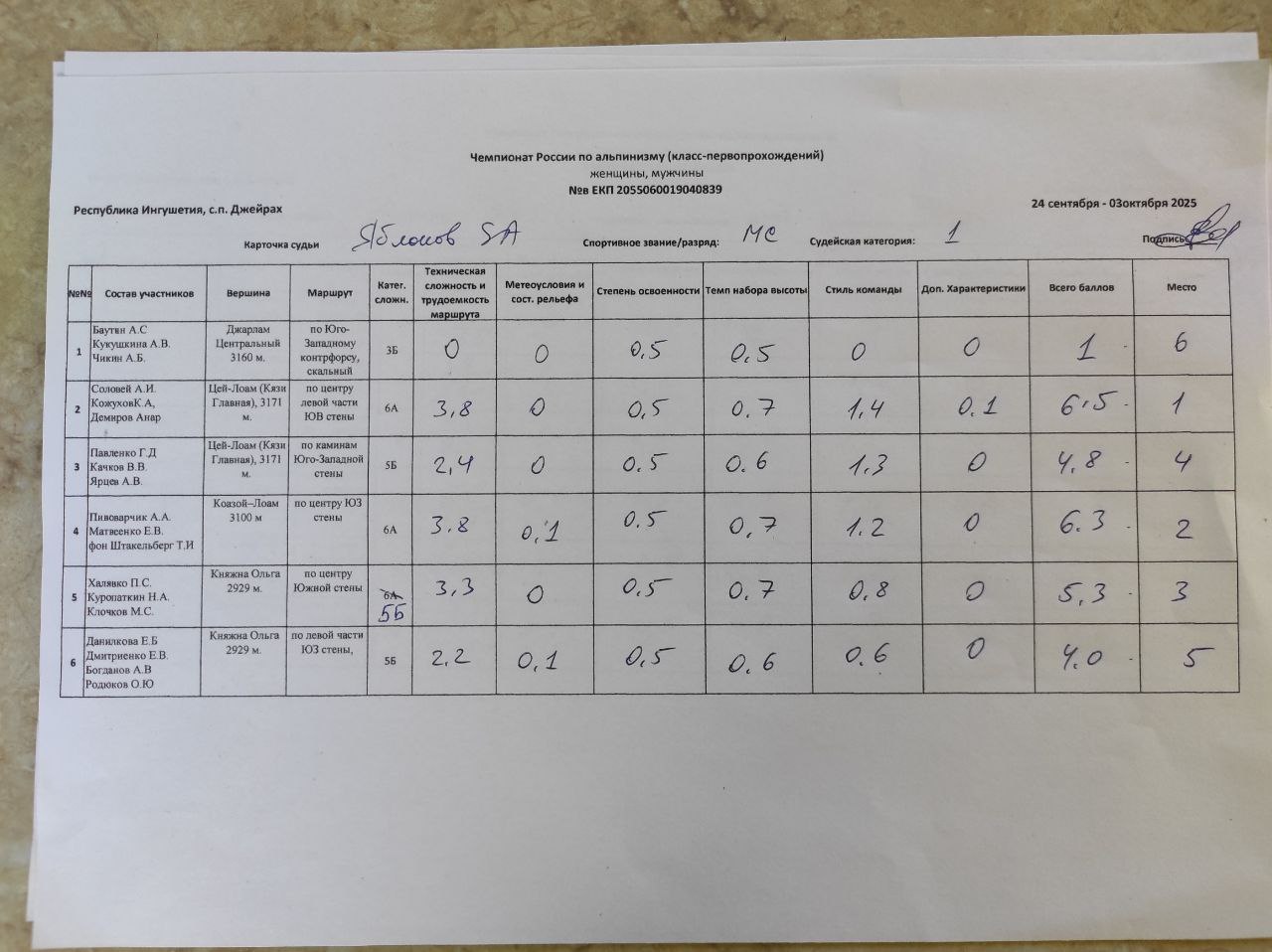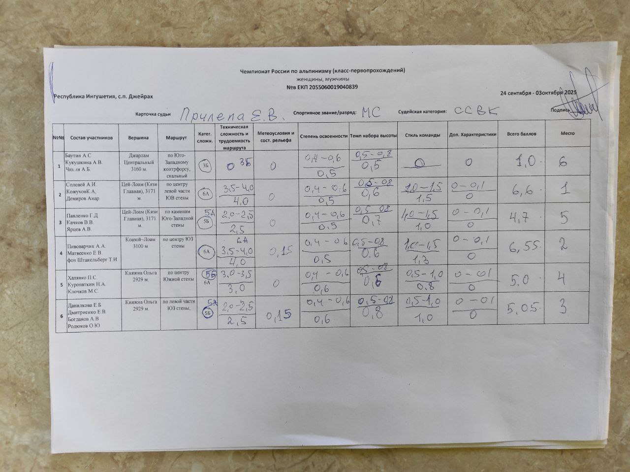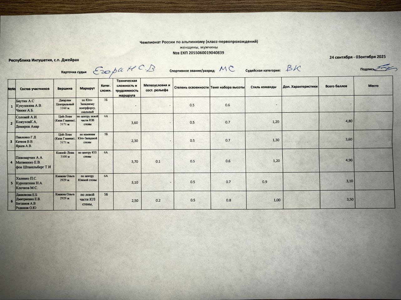 7.2. Оценку восхождений и определение мест, занимаемых командами, судейская бригада производит на основании отчетов, в соответствии с «Методикой оценки восхождений при судействе высотного, высотно-технического, ледово-снежного классов и класса-первопрохождений соревнований по альпинизму».