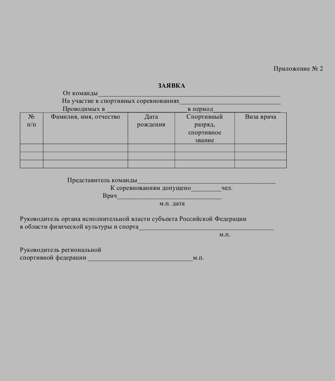 Предварительная заявка (приложение №1), содержащая информацию о составе спортивной сборной команды, участвующей в спортивном соревновании, подписанная руководителем региональной федерации и согласованная с руководителем органа исполнительной власти субъекта Российской Федерации в области физической культуры и спорта, направляется на электронную почту главного секретаря соревнований mbu.gkt@yandex.ru не позднее 15 декабря 2025 года.