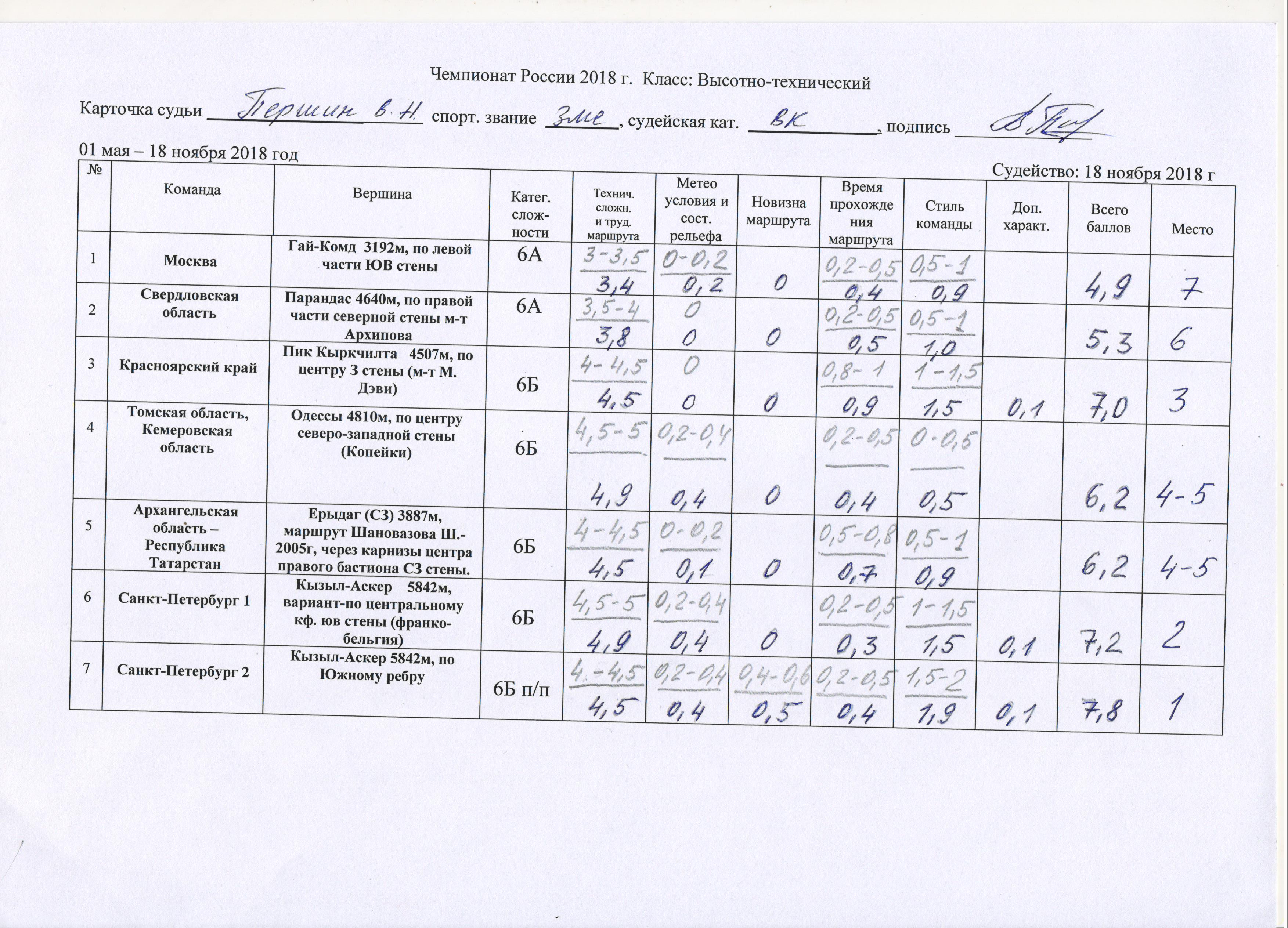 6.3. Оценку восхождений и определение мест, занимаемых командами, судейская коллегия производит в соответствии с «Методикой оценки восхождений при судействе соревнований по альпинизму» на основании отчетов.» Лучшей признается команда, набравшая наибольшее количество баллов.