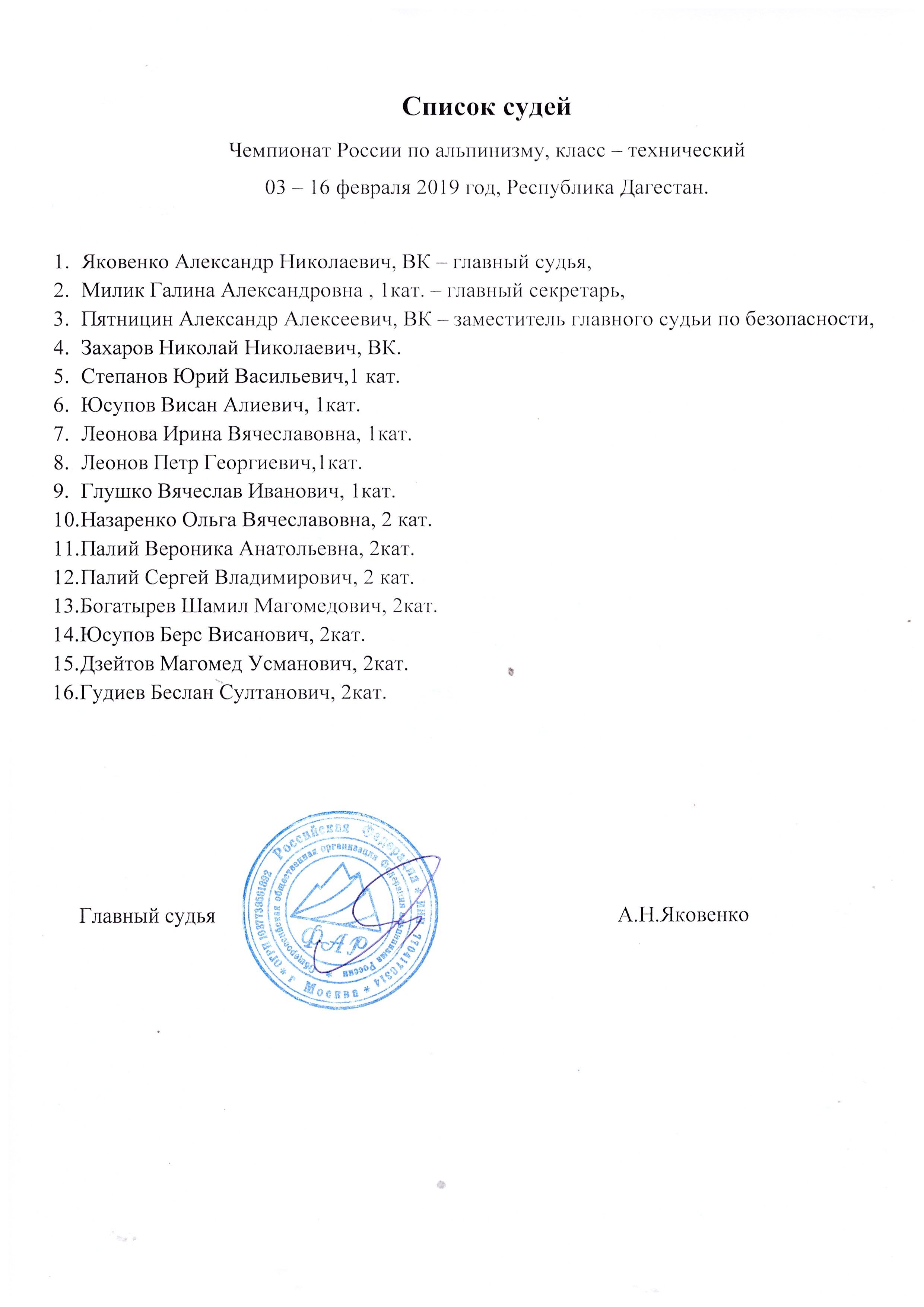 Итоговый протокол и список судей.
