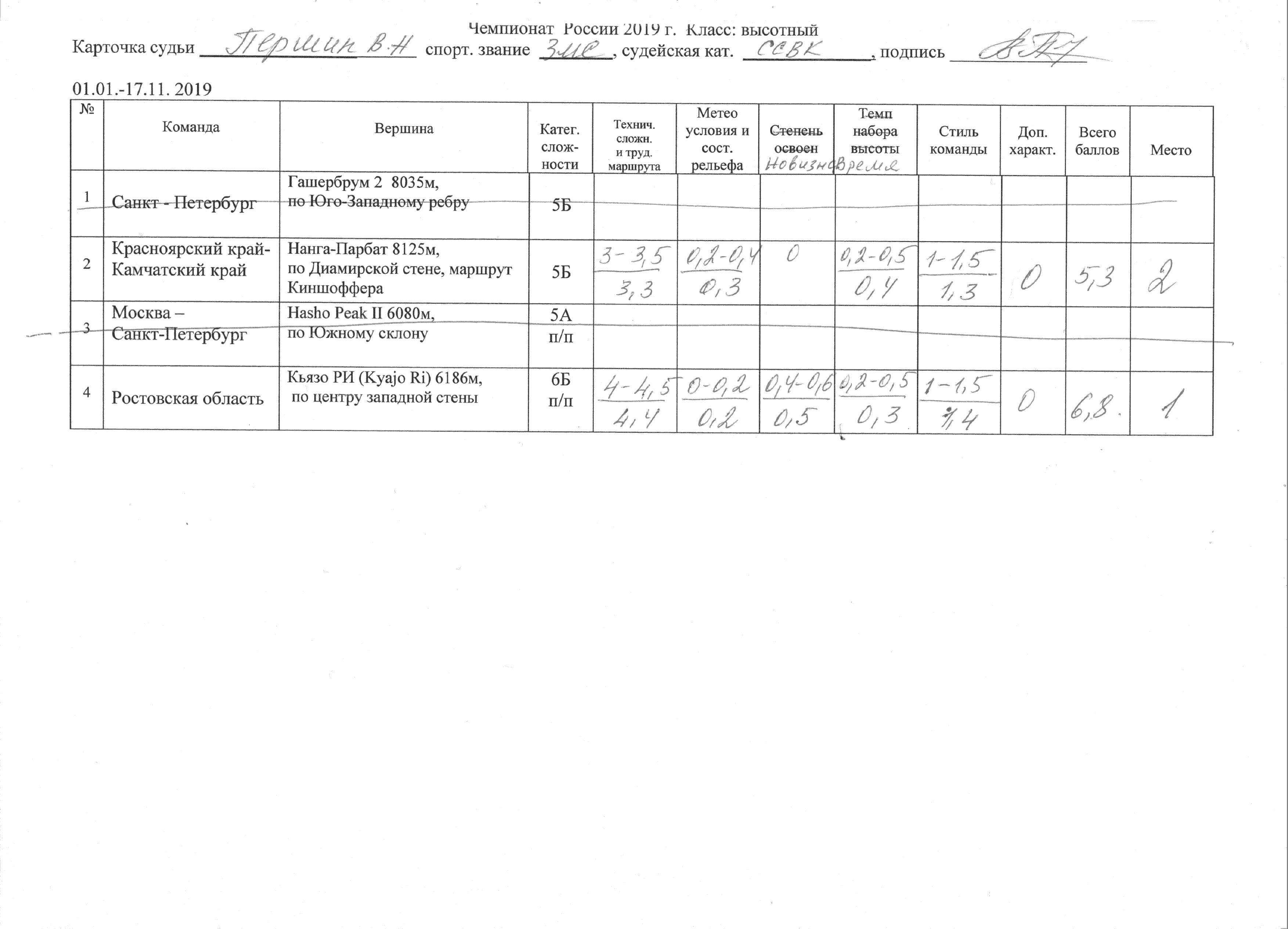 4.1. Дата выезда команды, а также выбор горного района, в котором совершается восхождение, определяются руководителем команды. К зачету принимаются все восхождения не ниже 5А категории сложности, совершенные в период чемпионата, по классифицированным и не классифицированным маршрутам, за исключением, пройденных в коммерческих группах и по обработанным маршрутам.