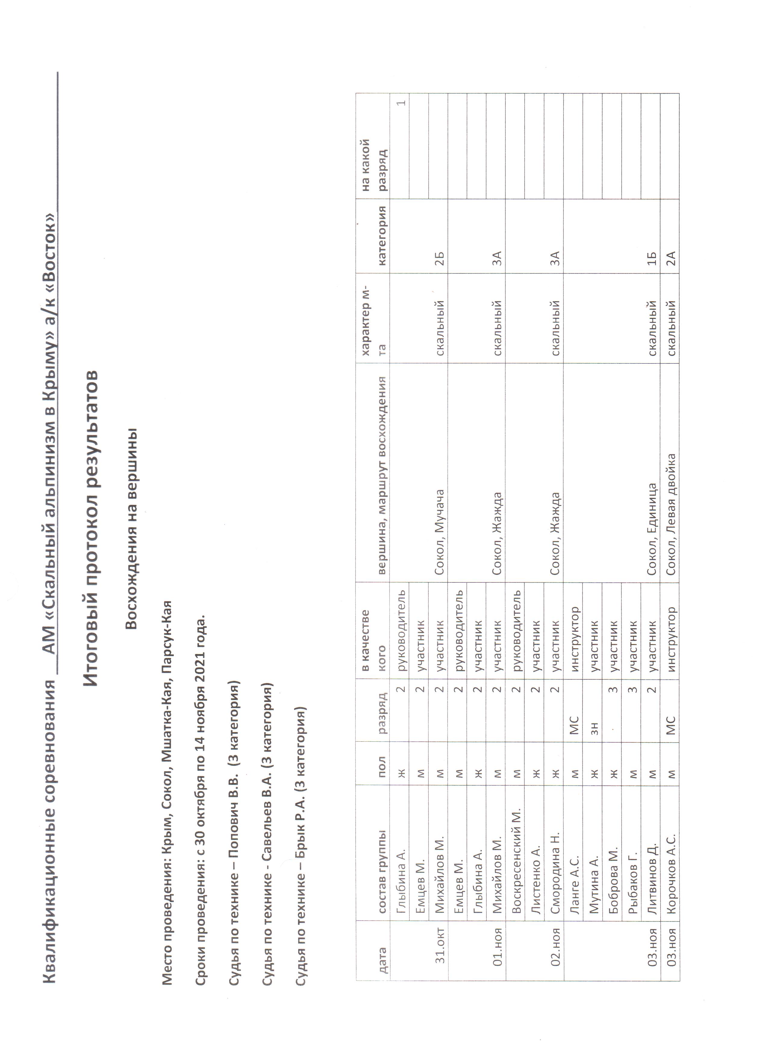 3 ноября – Восхождение на вершину Сокол (маршрут 2А к/тр. «Двойка слева»), разбор восхождения, занятия.