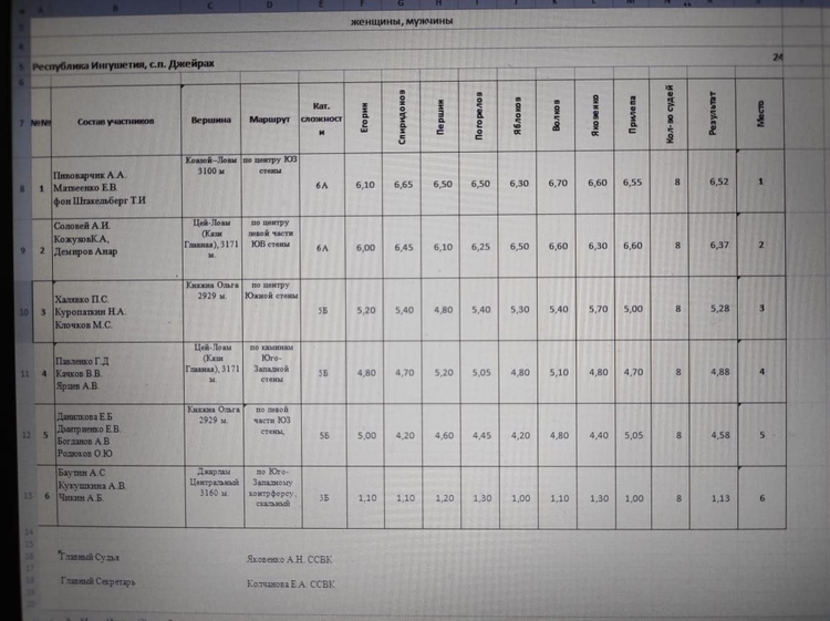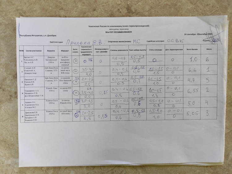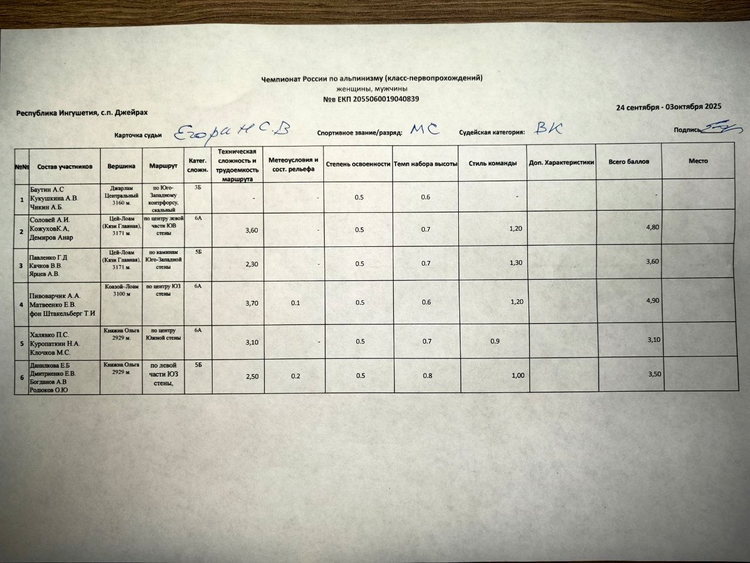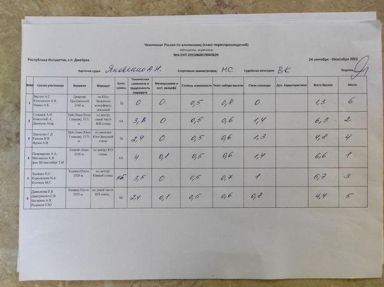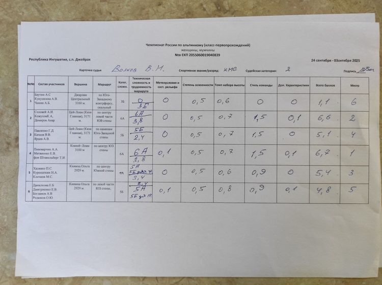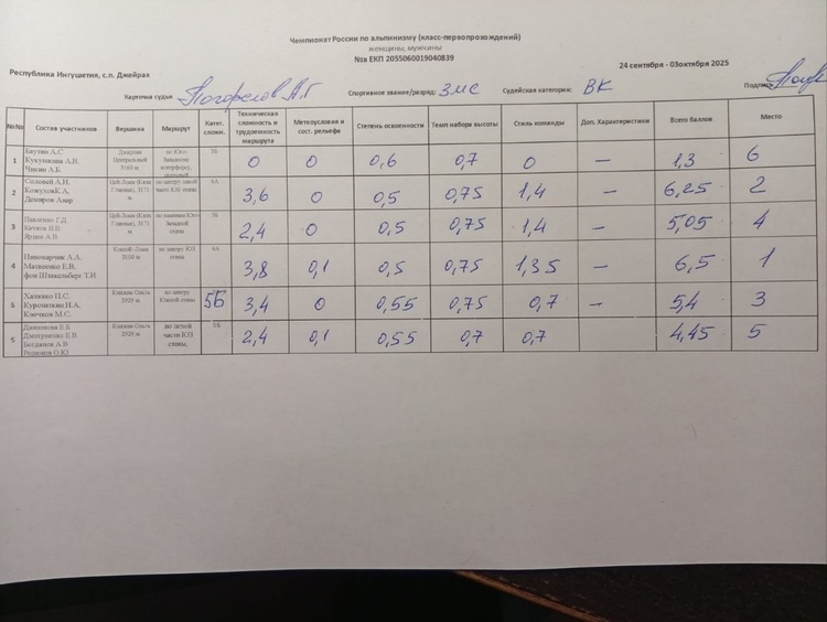 Утверждены результаты "Чемпионата России по альпинизму, класс-первопрохождений". Протокол заседания судейской коллегии с участниками ЧР, утверждение результатов ЧР ПП 02.10.2025 г. Чемпионат проходил с 24 сентября по 02 октября 2025 г., в Республике Ингушетия, с.п. Джейрах.