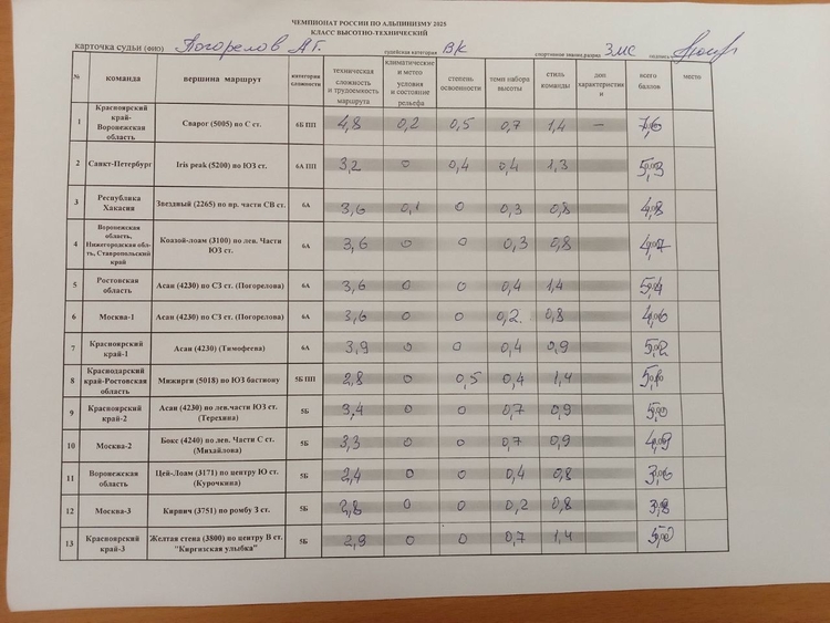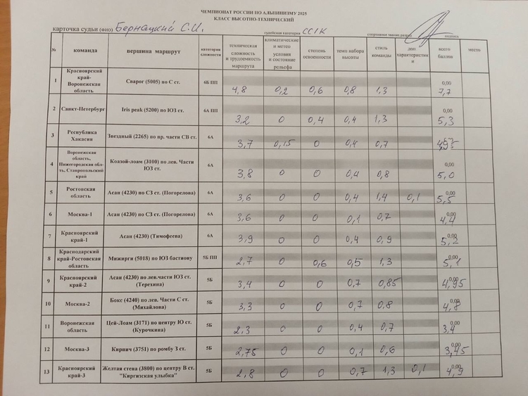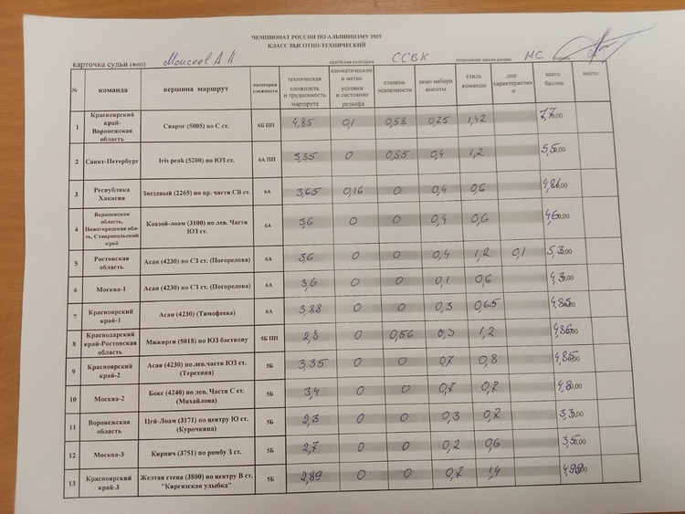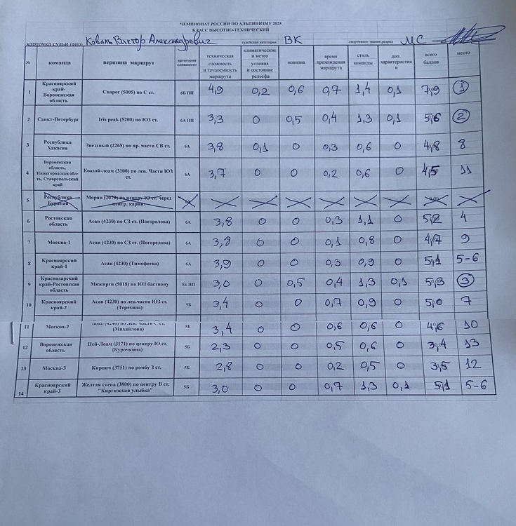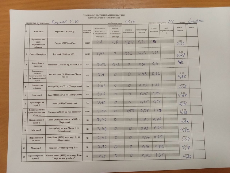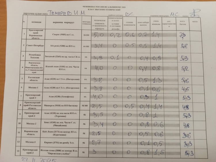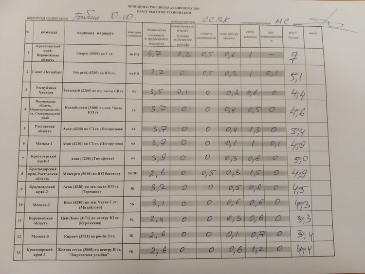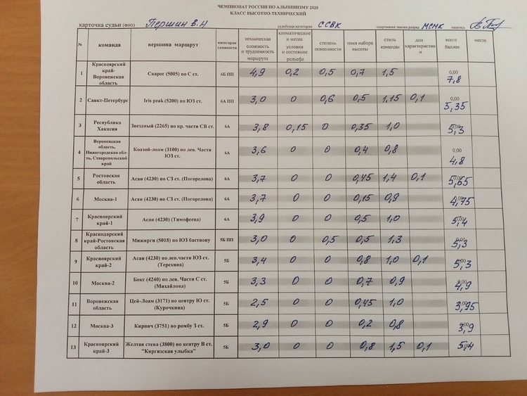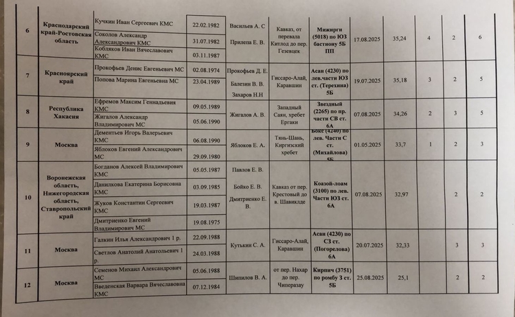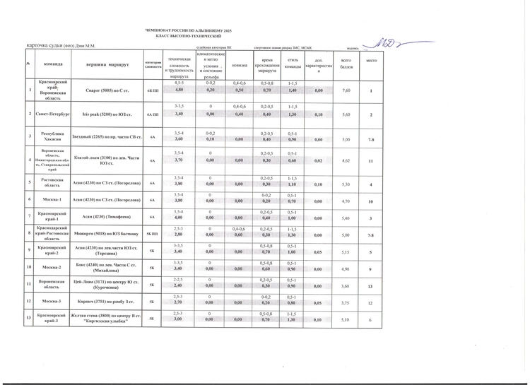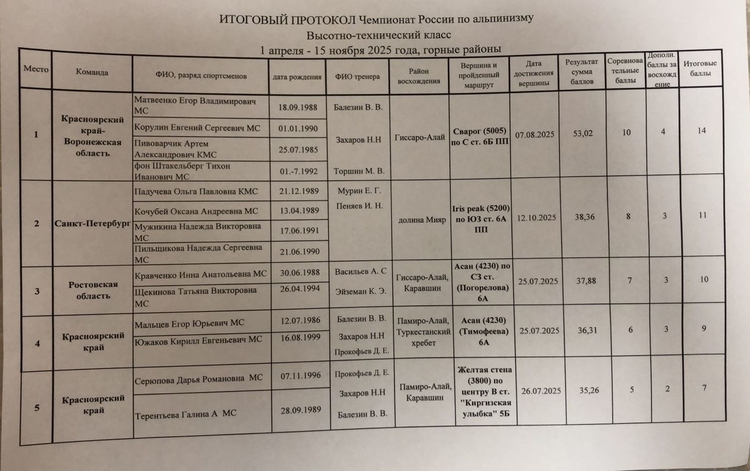 Предварительный Протокол Чемпионата России по альпинизму 2025, класс высотно-технический